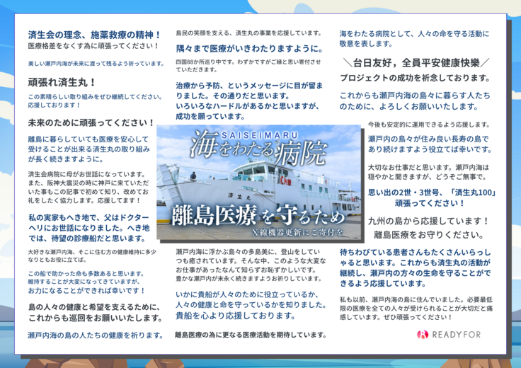 6月2日からスタートした『海をわたり島の人々の命をつなぐ。巡回診療船「済生丸」が運ぶ希望の光』プロジェクトですが、現在なんと、窓口でのご寄付も含めると700名以上もの皆さまにご寄付をいただいております。ここまで応援いただき、心より御礼申し上げます。
