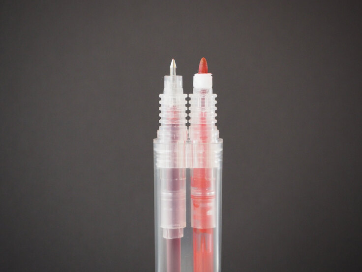チェックペンやマーカーは、ペン本体にインクを含ませた中綿を内蔵しペン先に接触させる「中綿式」が主流です。インクを最後まで使い切ることができず、内部の毛細管力が弱まると書きづらく疲れやすい特徴があります。