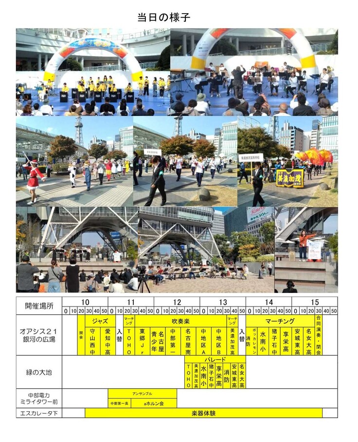 当日(11月5日)は、11月とは思えない暑さの中ではありましたが、晴天に恵まれ、野外の演奏も含め全てを予定通り行うことができました。小中高生を中心に16団体650名が参加し、大勢の観客の前で演奏・演技を披露し、栄の街にコロナ禍以前の賑わいを取り戻すことができました。