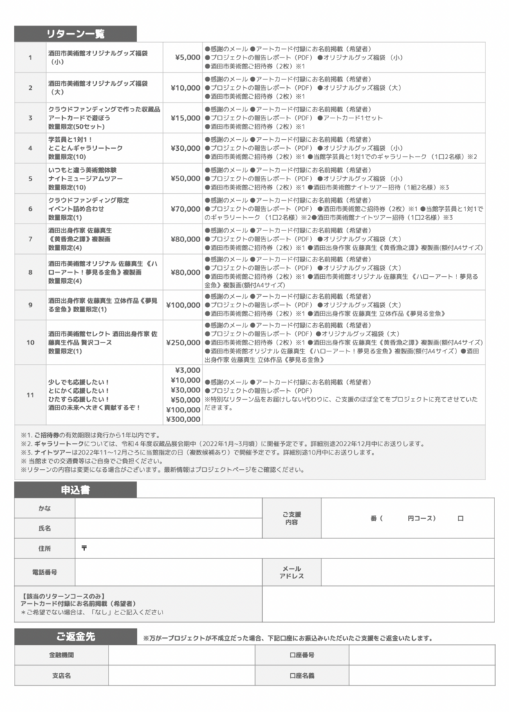 一方、操作方法が分からないという方からは、「代理支援」という形でのご支援も承っています。酒田市美術館に直接ご支援金をお振込みいただき、酒田市美術館が手続きを代行してクラウドファンディングに反映させるという方法です。