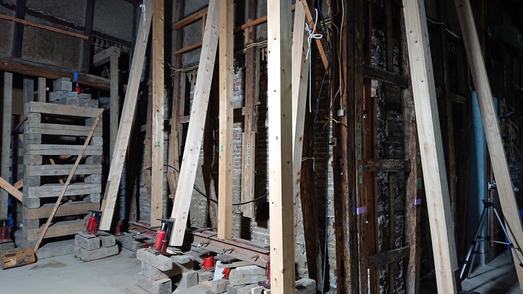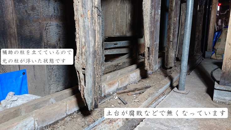 現在は腐食した柱の代わりに補助の柱を横に立てて建物の倒壊を防いでいます