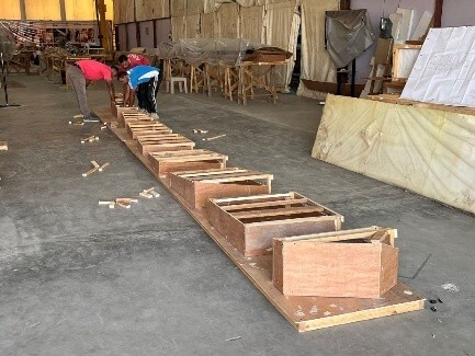 部材Aを博物館に搬入し、スケルトンに取り付けて、最終的な形状の調整をします。