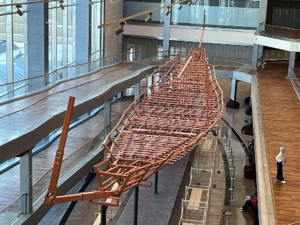 11月1日に大エジプト博物館が最終的なオープンを迎え、クフ王の第1の船の一般公開も始まりました。クフ王第2の船が復原されるプラットフォームには、補強用の鉄製のスケルトン(骨組み)が組み上がっています。これからは、合計約1650点の部材一つ一つを、それぞれ次の4つの段階を経て組み立てて船を復原していきます。
