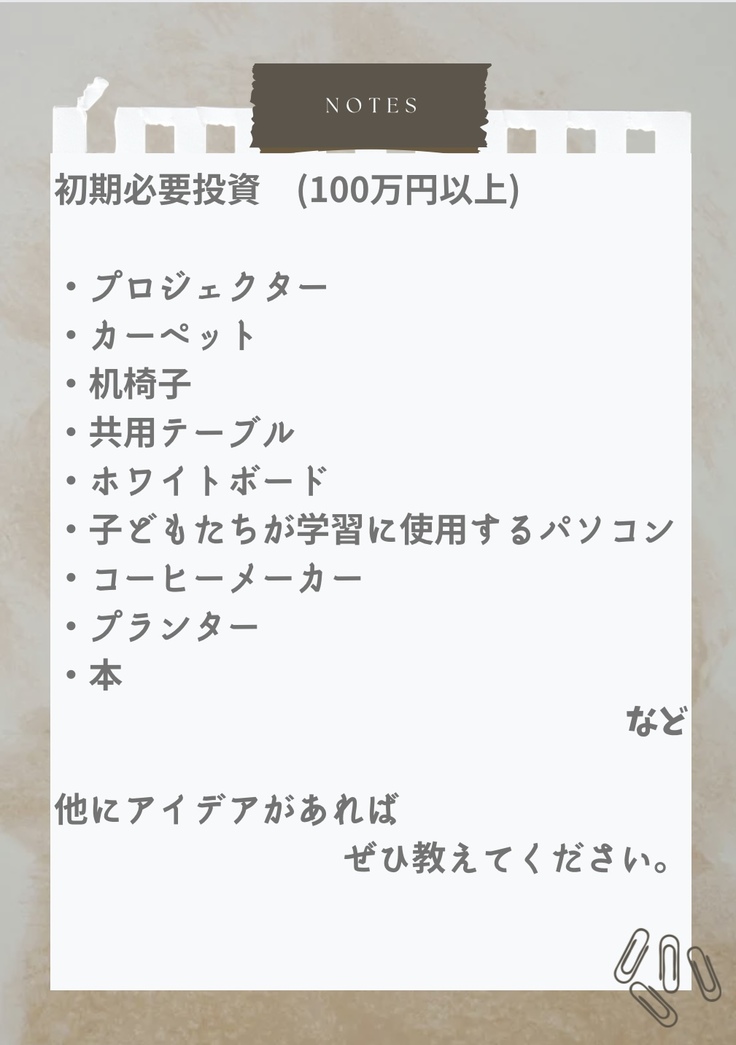 名古屋市周辺に大人から子どもまで利用できる学習スペースを設立する。 借家、家賃90万円(月15万の賃貸、敷金礼金や初期3ヶ月分を想定) 教室準備のための 設備投資(60万) プロジェクター デスク•チェア カーペット 防犯カメラ 教材など 公共料金(電気水道ガス) 家賃等の初期投資+室内の設備投資 計150万円 なお、今後経費がかさむことが想定される場合は設備投資を減らし、それでも足りない場合は自己資金で補います。