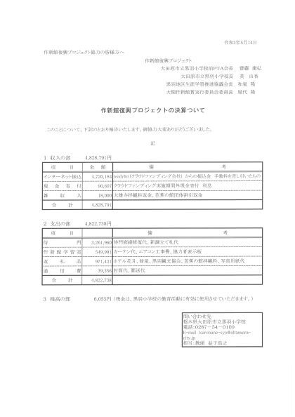 残金の¥6,053-については、黒羽小学校の教育活動の補助として活用させていただきます。御理解ください。