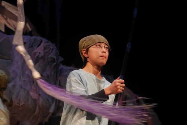 水中生物役のジュンキです。 僕は今年からこの巨大人形劇に参加させてもらいました。はじめは、中学生の僕に出来る事があるのかと、不安になる事もありましたが、皆さんから教えてもらってやるうちに自信がついてきました。 ぼくが色を塗ったり貼り合わせたりと手伝ったのが、大きなカニやさんしょううおの手足になった時には感動しました。