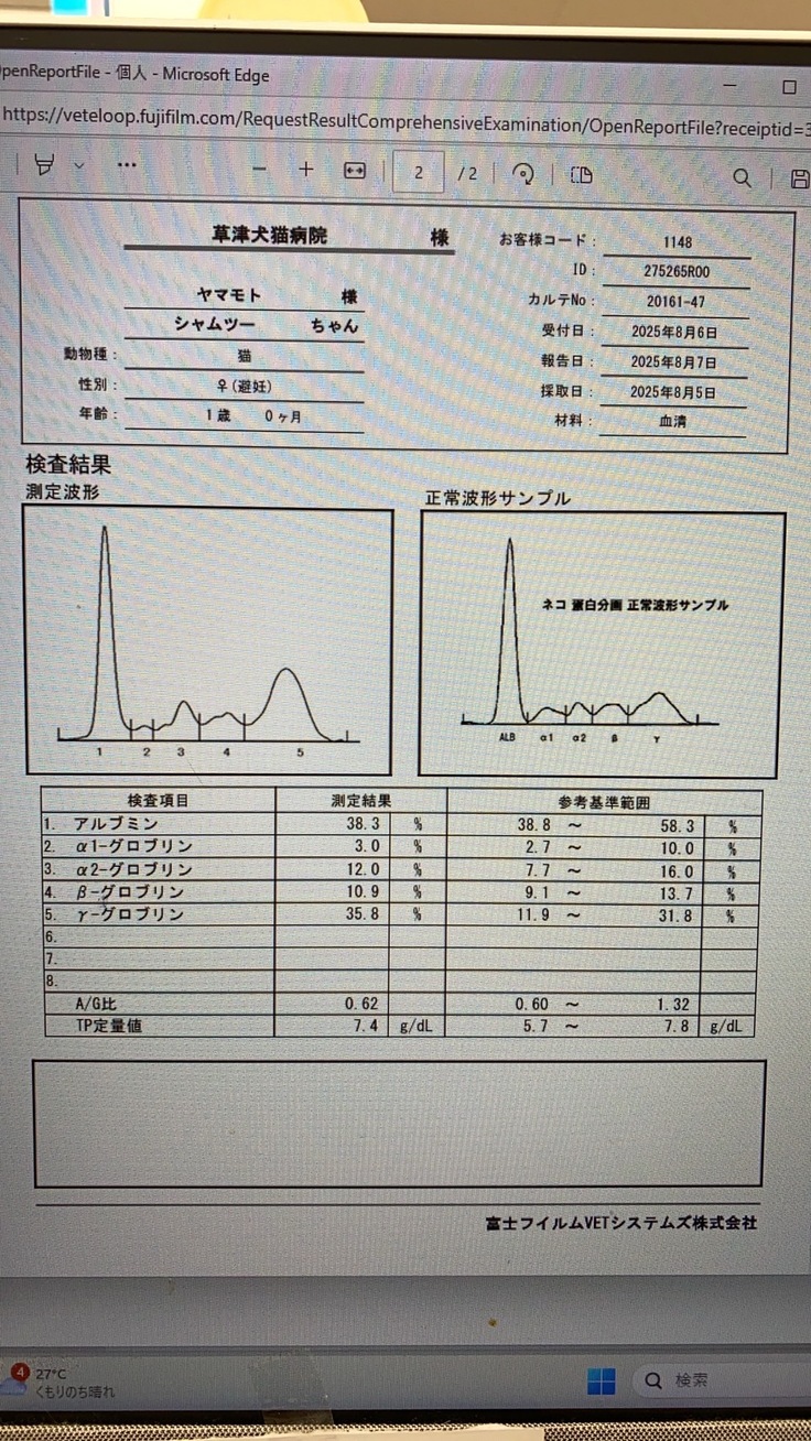 蛋白分画検査しましたがまだ投薬が必要で2回目の追加となりました