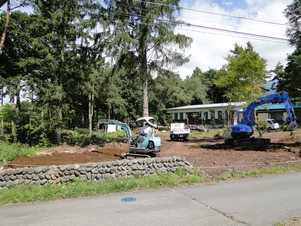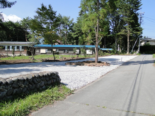 木を伐採、伐根するだけでもたいへんな作業となりました。木々を整理した後、石垣をこわして、土や砂利を入れて整地しています。
