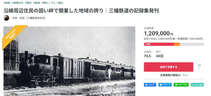 9月1日から公開しました三蟠鉄道記録集発刊プロジェクトにクラウドファンディングを取り入れたところ約半月で第一目標である100万円を達成することができました。