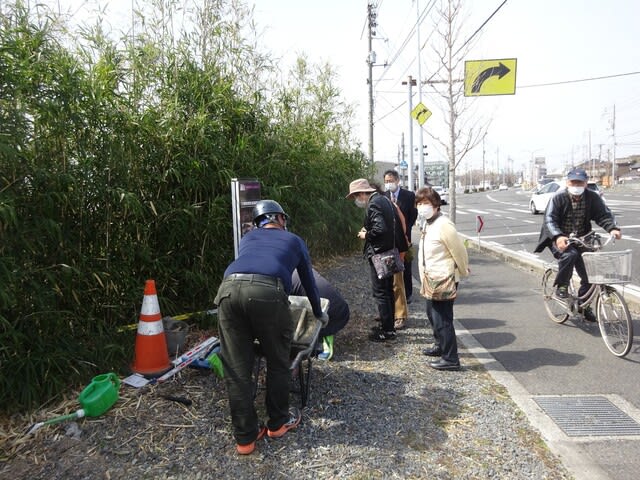 設置に立ち会ってもらった東山公民館館長ほか皆さんありがとうございました。この看板を末永く守ってまいります。