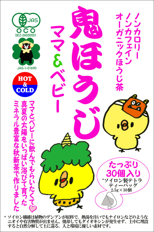 日本国内では、今年の秋から「鬼ほうじママ&ベビー」というノンカフェイン・ノンカロリー・オーガニックほうじ茶をリリースしています。