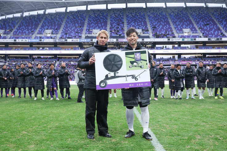 ピースウイングのピッチに紫の風を起こそうと皆さまの支援で購入した送風機。支援者のみなさまにも一目でわかるように紫の風を起こそうプロジェクトの装飾をしています。試合当日に森崎和幸実行委員長から佐々木翔選手へ贈呈しました。