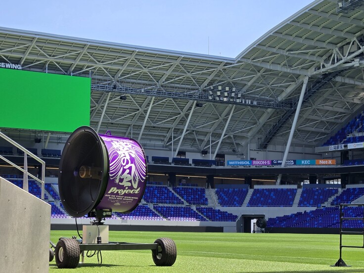 現在も送風機はピースウイングのピッチに風を送り込んでいます。風が吹くことで芝生表面の温度が下がり、特に暑い夏は芝生の育成には欠かせないとのことです。みなさまの支援がピースウイングのピッチコンディション維持に貢献をしてくれています。試合の無い日はピッチ上で活躍する送風機を見ることができます。スタジアムを見学の際は、送風機にも注目してください。