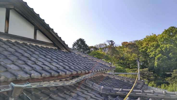 登録有形文化財「隆泉苑」改修のプロジェクトの第一期改修を終了したのち、約1カ月の間建物を休めました。第二期改修は、4月10日より外部足場組をはじめました。「建物中心部である書院之間、次之間、続之間、控之間、玄関之間、台所、配膳室付近」を第二期工事の範囲とし、屋根の下地補修および瓦の葺き替えを行い、6月末に完了しました。