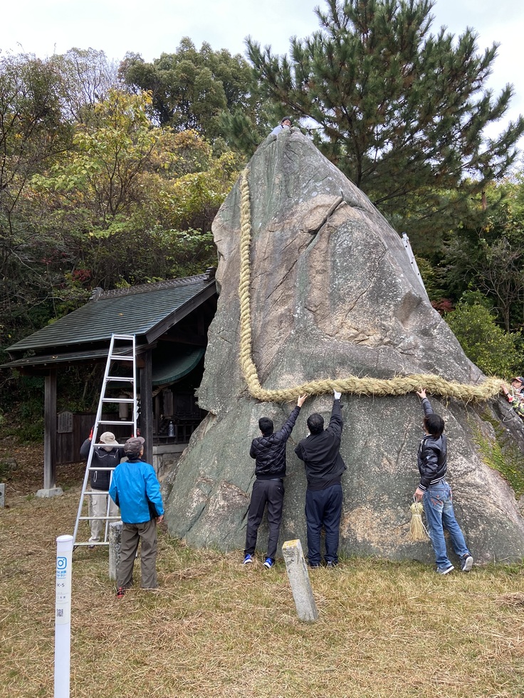 二年前から庭園内の草刈り、植栽の手入れを行ってきている。2022年12月にはメンヒルにかかっていた大しめ縄が新型コロナの影響で3年放置されたままになっていた。そこでゆめしま俱楽部、地元保存会と有志で新調し2023年元旦を迎えることができた。