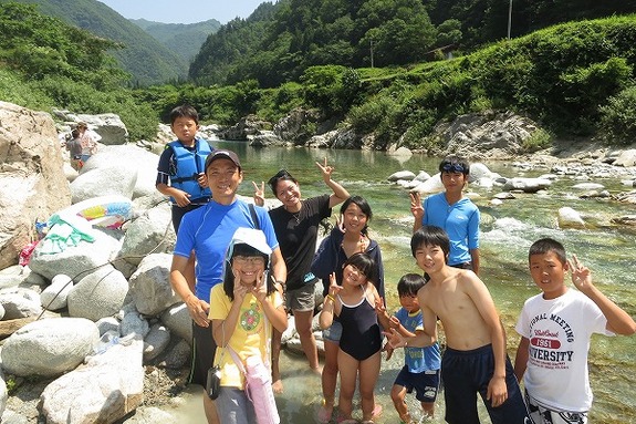 日中は30度を超える暑さで毎日川遊びに出かけ、魚とりや飛び込みをして楽しみました。
