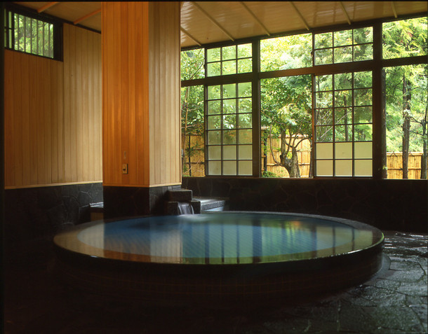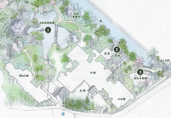 山を借景として、中心に池を置き、自然の土地の起伏を生かして池の周りに回遊路が造られている回遊式庭園です。二つの滝から二本の温泉水の川が池に流れ込んでおり、温泉水のせいで池の鯉は冬眠することなく、一年中元気に泳ぎ、訪れる人々を楽しませています。