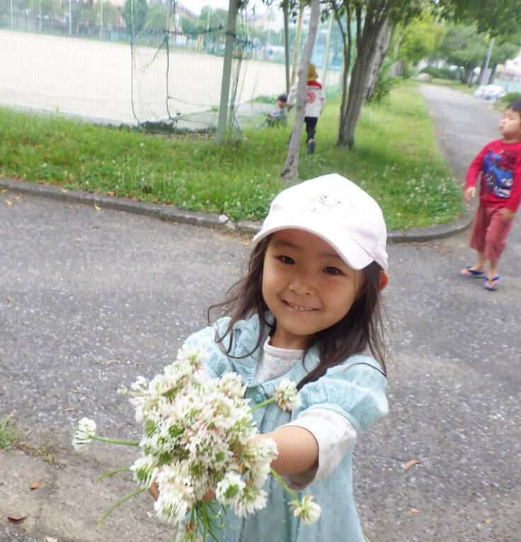 春には、シロツメクサの花束をつくり、桑の実を味わい、