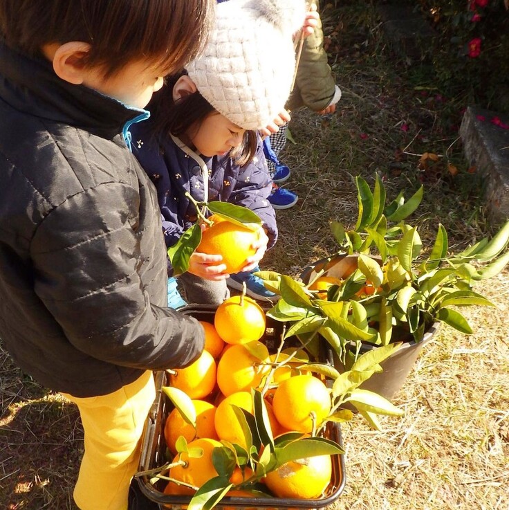 冬には、八朔を収穫し、オナモミの実で遊びます。