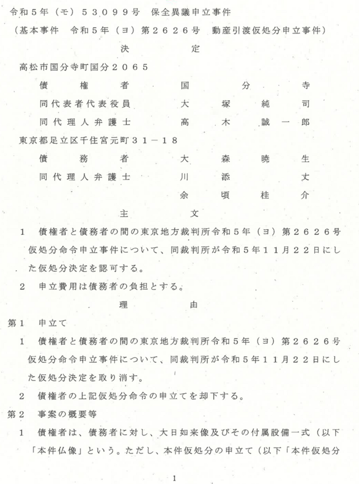 このようにして、仏像が東京地方裁判所の決定を経て引き渡され、当寺において公開の準備を進めていたところ、大森氏は、仏像の著作権等を主張し、その公開の差し止めを求める仮処分を高松地方裁判所に申し立てました。その結果、実質的な審理が行われないまま、拙速に公開の差し止めが認められてしまい、現在も公開が妨げられている状況にあります。