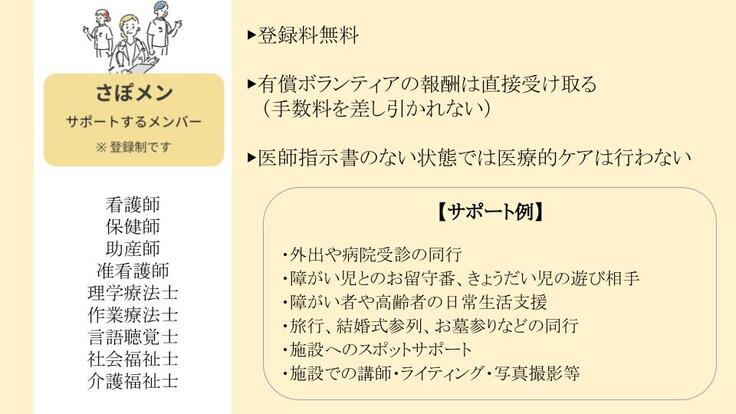 『さぽんて』はこうしたニーズに対して、手伝いたい、もっと力を発揮したい医療・福祉の有資格者が手を挙げてサポートする仕組みです。