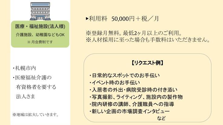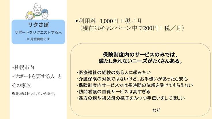 私たちは、保険制度内での医療・福祉・介護サービスのみでは満たせない「ちょっと助けてほしい」ニーズがある人たちと、「サポートしたい」「すきま時間で働きたい」と思っている医療・福祉の有資格者とが、つながる場をつくるため、札幌を中心に活動しています。