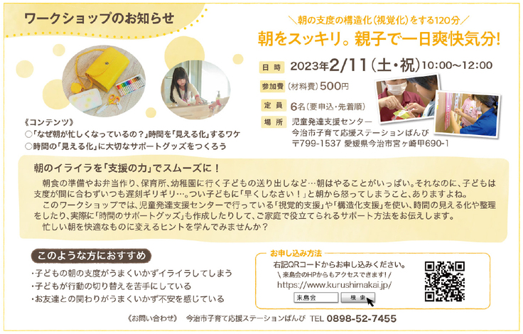 今日は、当法人の児童発達支援センター(今治市子育て応援ステーションばんび)にて、ワークショップ「朝をスッキリ。親子で1日爽快気分!‐朝の支度の構造化(視覚化)をする‐」を開催します。