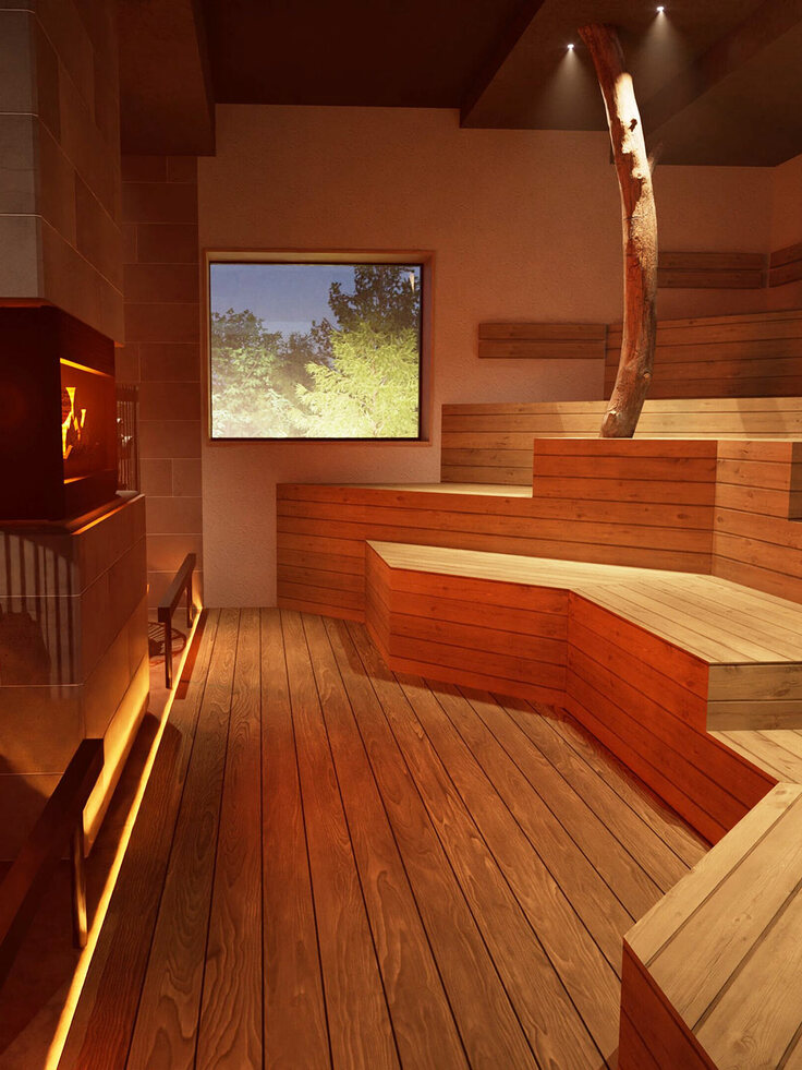 高低差のある座面が表現するのは、まさに里山。躍動感溢れる欅を設置。 傾斜のある里山で、水と共に生きる樹木を眺めるようなサウナ室は、室内にいながら自然を感じる事ができます✨