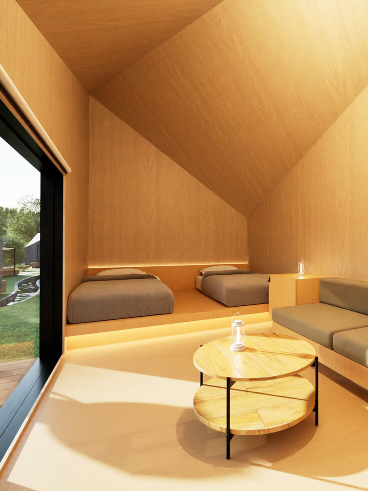 ⛰️地元・鋸山(のこぎりやま)の形をイメージしたキャビンは、外観からも里山の集落の風景を感じられる設計・配置で他では見ない宿泊棟となっております!全室にウッドデッキを備え、ワンちゃんと宿泊できるドッグガーデン付きキャビンもございます🐶自然と調和した空間でありながら、エアコンやベッドを完備し、快適性にもこだわっています✨
