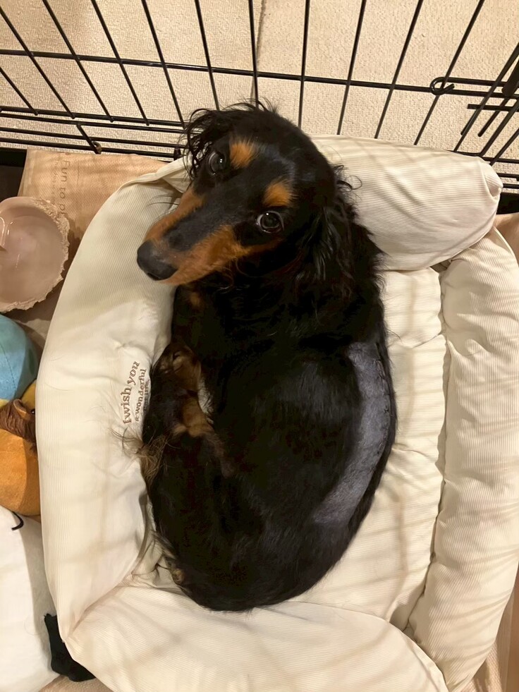 診断は「進行性脊髄軟化症を伴う重度椎間板ヘルニア」。命の危険を乗り越え、現在は自宅で絶対安静の中、少しずつリハビリを頑張っています。