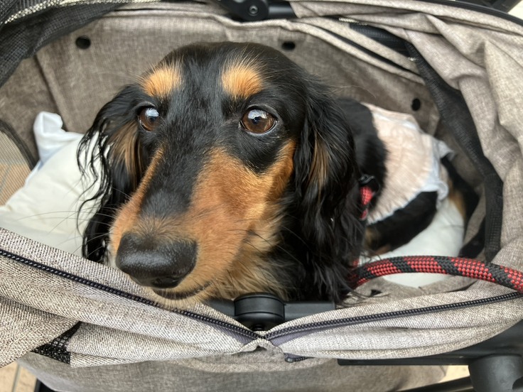 直近カートで連れ出した際のお顔。オムツは欠かせませんが、リラックスしてます🌞