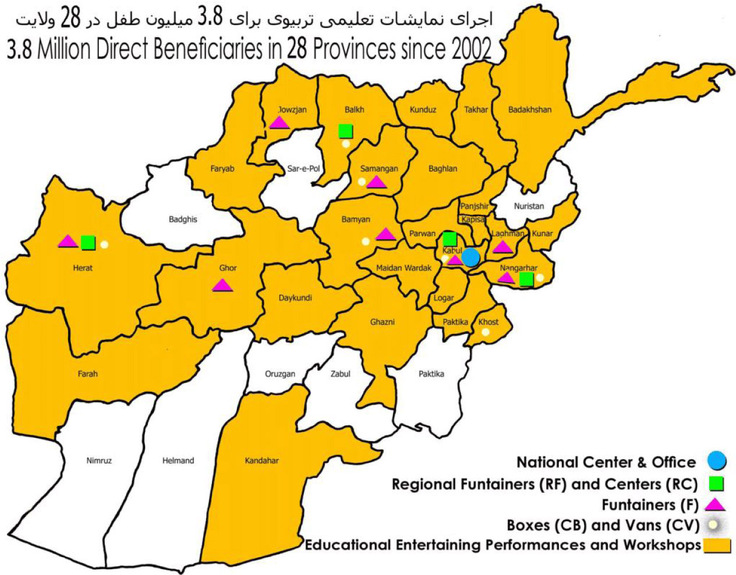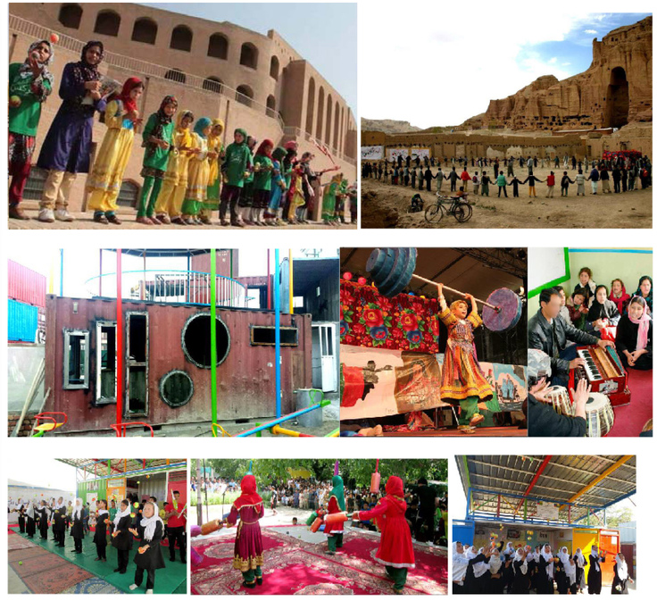 アフガニスタンの現地NGOは、この20年で、28州400万人の人々に、文化芸術活動を通じた様々な教育プログラムを提供してきました。当初より、識字率の低い辺境の村々を回り、演劇や、歌などを通じて、子どもたちに衛生教育、人権教育、平和教育、地雷回避教育など、国連や各国政府の委託を受け、活動をしてきました。