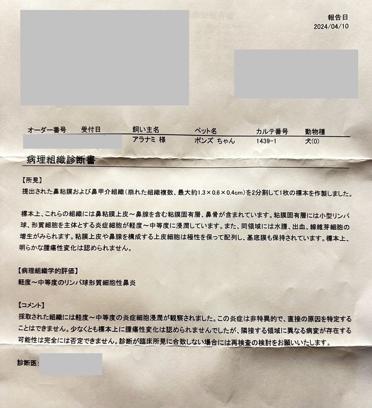 レーザーで鼻の中の軟骨を焼いた時に採った組織の病理検査結果が出ました。