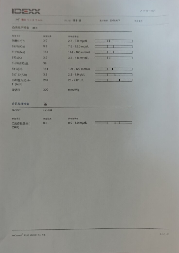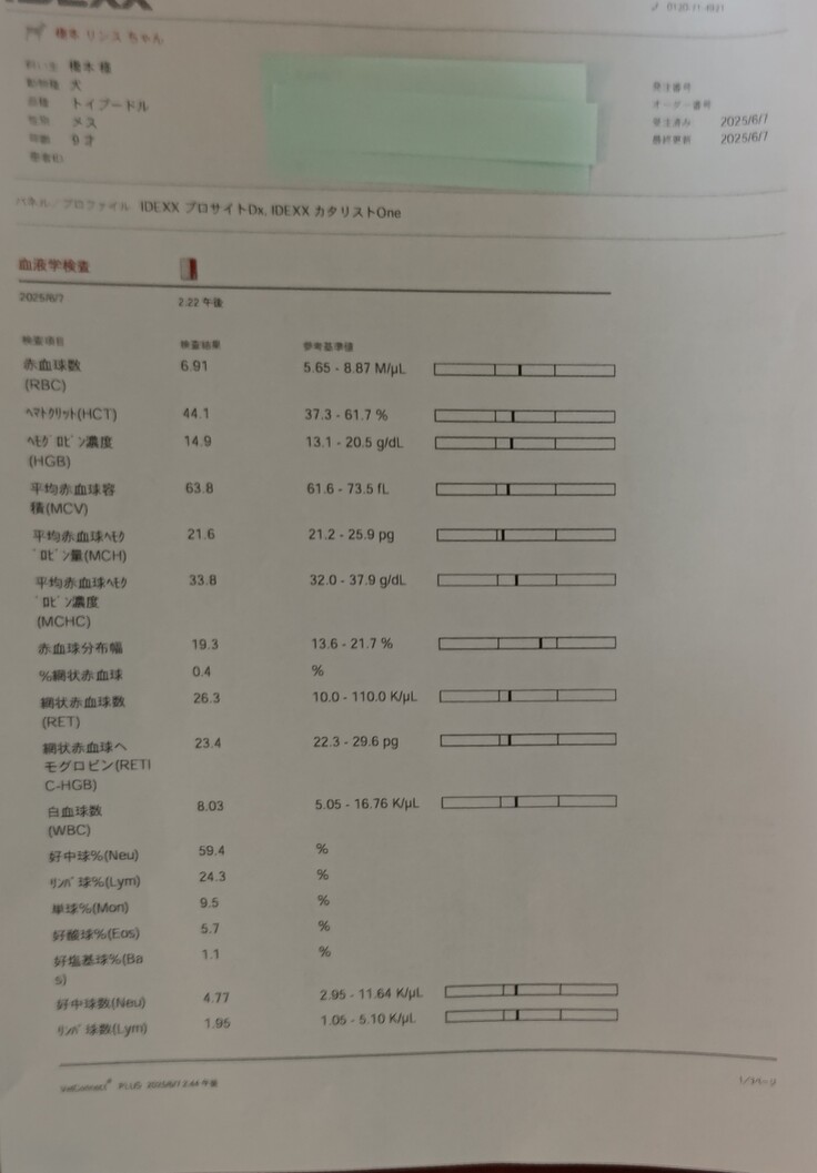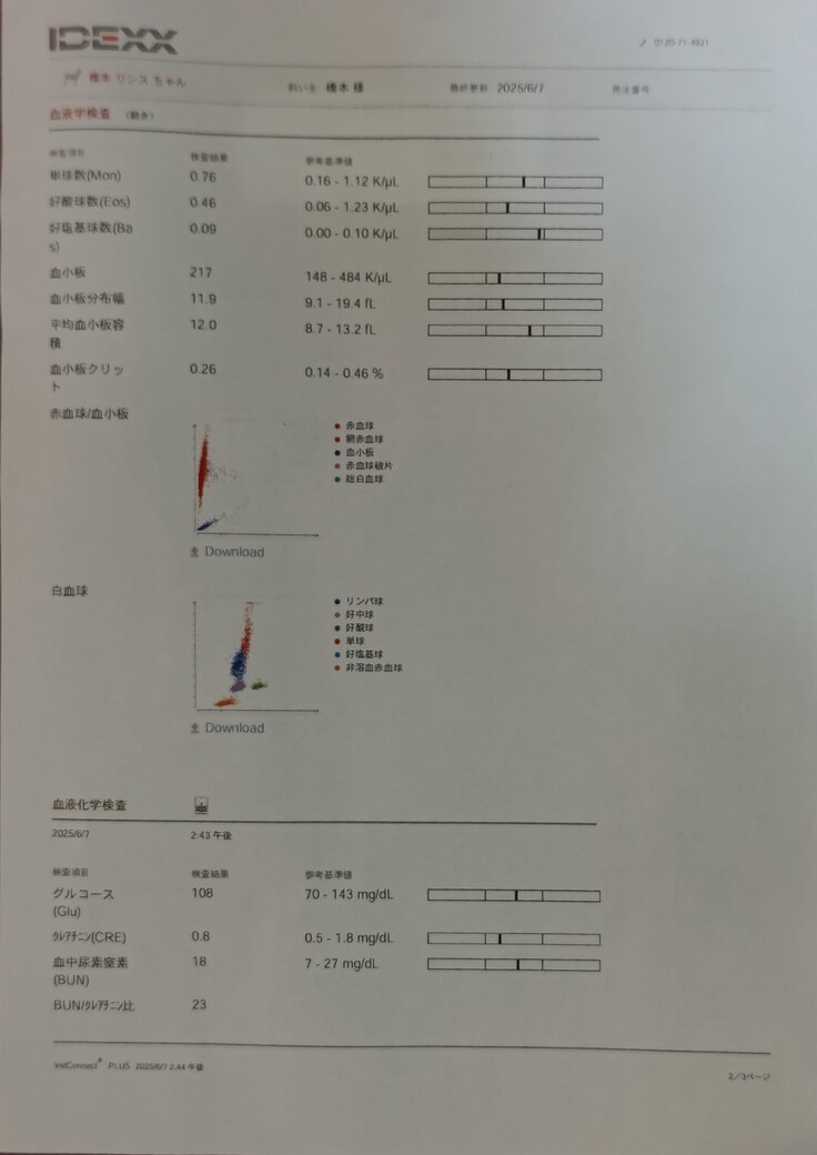 貧血無し、炎症反応正常値、腎機能正常値、肝機能正常値