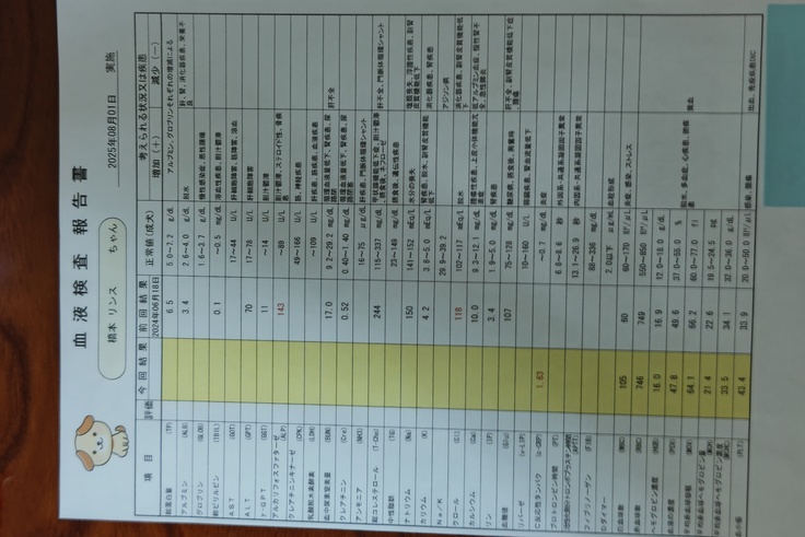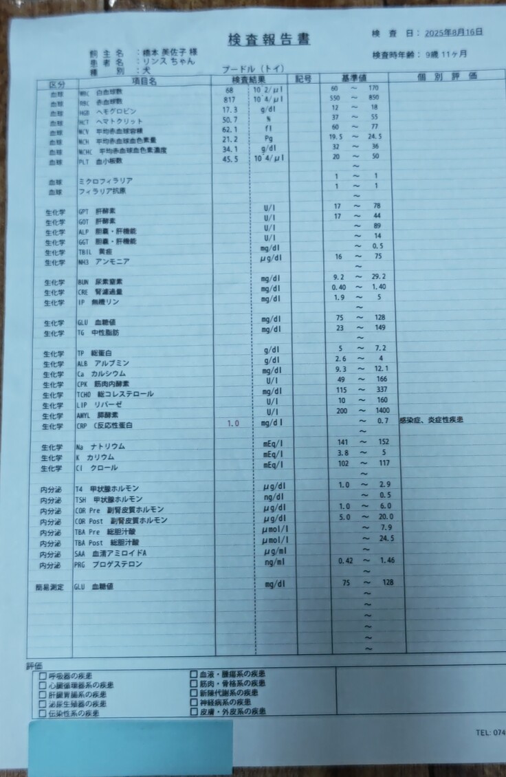 子宮水腫もあり、子宮蓄膿症にならないか注意が必要で、念の為に血液検査も実施されました。