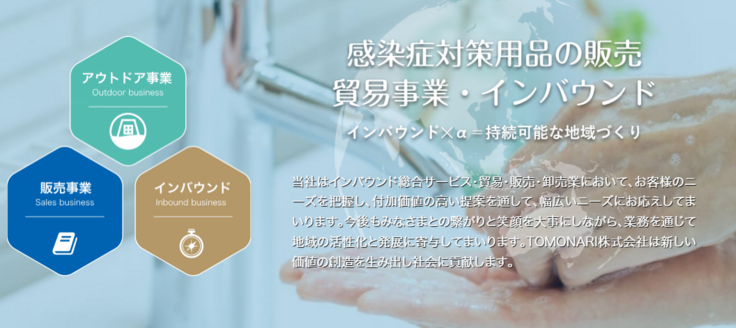 貿易販売事業(全国販売店300社程度)、アウトドア事業(沢田テント)、OEM受託、インバウンド総合サービス事業(鳥取県・島根県の委託事業など含む)を展開、拠点は鳥取県。 2017年9月 TOMONARI株式会社を設立 2018年1月 旅行サービス手配業者鳥取県第一号に登録 2019年11月 TOMONARI株式会社上海事務所開設 2019年4月 不織布マスクなど輸入販売開始 2020年10月 CO2モニター販売開始 2021年1月 自社ブランド「CO2モニターピピっと換気君」リリース 2021年5月 自社ブランド「沢田テント」立ち上げ 2022年4月 CO2モニター累計6万台突破 2022年4月 所ジョージの世田谷ベースに沢田テント掲載 衛生用品、小型家電、アウトドア商品等のの企画・開発を日々実行中 その他、地域貢献事業も行い、現在鳥取県大山に観光グランピング施設を準備中