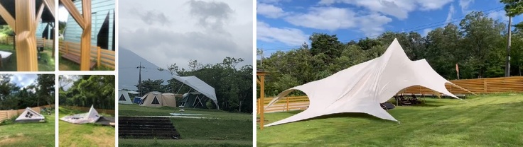 また、施設スタッフがテントのメンテナンスに要する労力も無視できず、悪天候時でもどっしりと安定して存在する宿泊施設の運行は魅力的です。