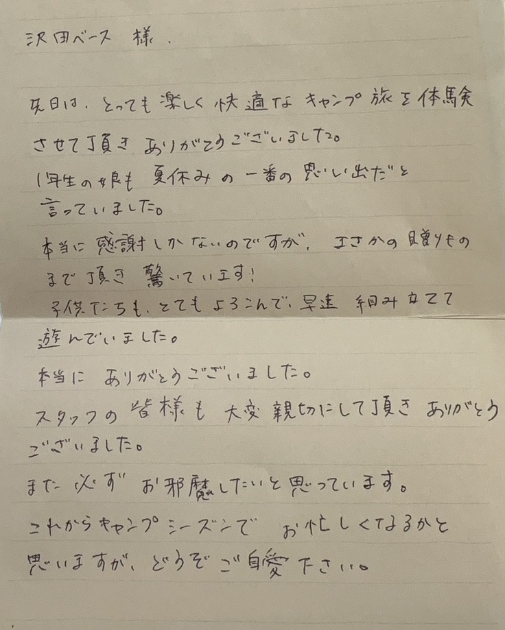 「手ぶらでキャンプが楽しめた。いい経験になりました」