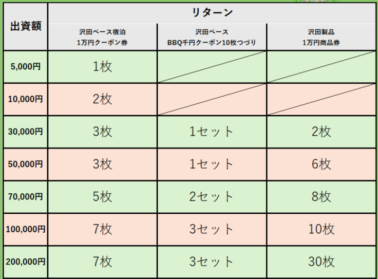 リターンとして、沢田ベースで使えるクーポン券、アウトドア用品=沢田製品の商品券を用意しています。