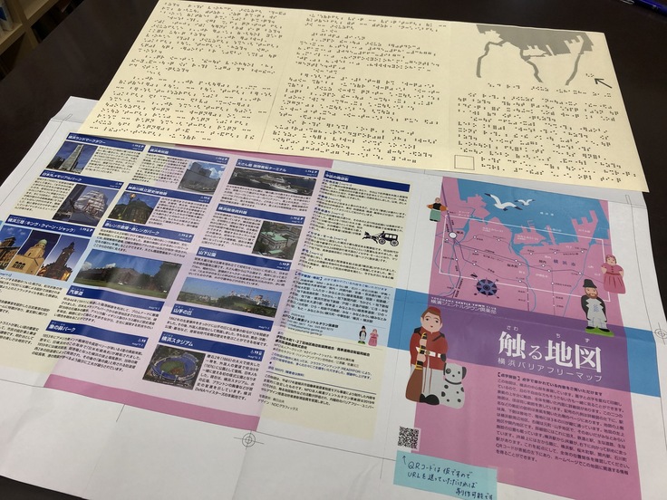 現在、地図面、おもて面ともに、カラー及び点字の地図・文章の版下案ができあがったところです。今後はこれを関係者に確認してもらい、情報の漏れがないか、より見やすくする工夫はないかなど、最終的な調整を行います。