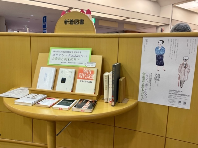 10月2日(水)まで、図書館1階閲覧室に入ってまっすぐのところにある新着図書の裏側に、金素雲、茨木のり子、沢知恵の本が展示してあります。