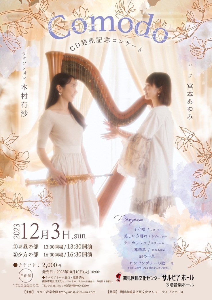 多くの人に親し身のある曲を中心に、ハープとサックスで演奏して合いそうな曲を選びました。