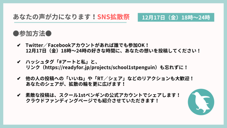 リンク(https://readyfor.jp/projects/school1stpenguin)も忘れずに!