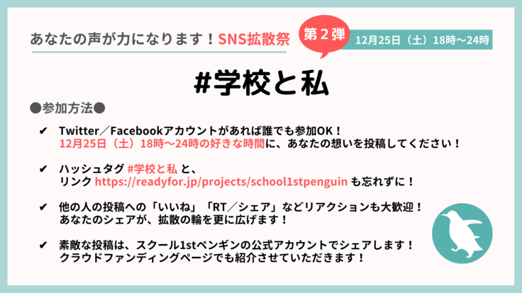 リンク(https://readyfor.jp/projects/school1stpenguin)も忘れずに!