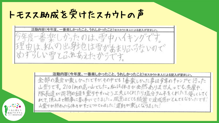 また、このトモスス助成により支援したご家庭に対してアンケートを行ったところ、普段、保護者同士の相談相手のひとつとして「ボーイスカウト関係者である」と回答する人が多いなど「孤独・孤立・孤育て」になりがちなひとり親家庭とボーイスカウトとは緩やかな繋がりを保てていることが分かりました。