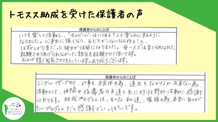 2023年11月24日にスタートしたクラウドファンディングは「体験格差」をなくすために、日本連盟で行っているひとり親家庭の子どもたちに1人あたり3万円の活動助成金を届ける「ともに進もう助成プログラム(トモスス助成)」の一部に充てるため支援を呼びかけました。