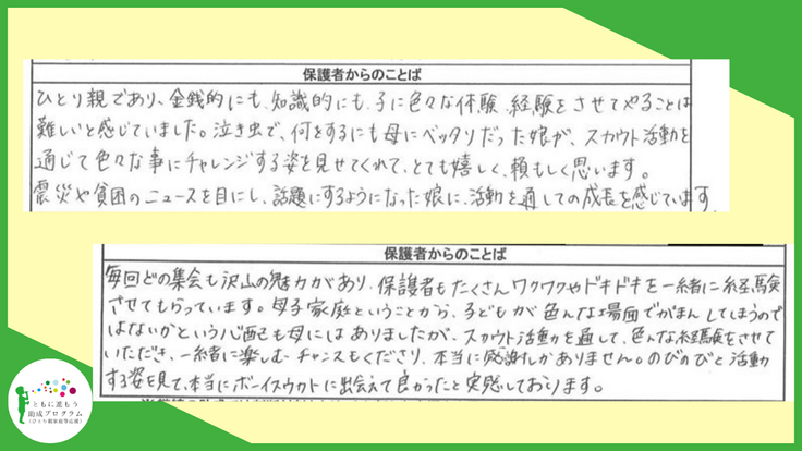 同時に、子どもたちの夏休みの様子を伺った質問では、保護者の経済的な理由のほかに時間的な余裕の確保が難しく、ボーイスカウト以外で子どもがやってみたいと思う体験活動を満足にさせてあげられなかったという声もあり、ひとり親家庭がボーイスカウトを選択しているという面と、ボーイスカウトしか選択できていないという選択格差の面が浮き彫りとなっており、新たな取組も必要と感じる内容でした。
