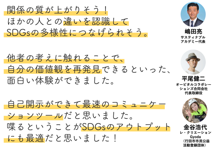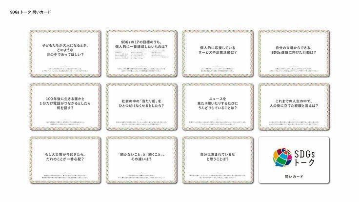 明確にSDGsテーマに根ざしているような問いもあれば、一見SDGsっぽくはないけれど、自分自身の価値観や意識していること、自分ならではの経験について振り返ることができる問いもあります。