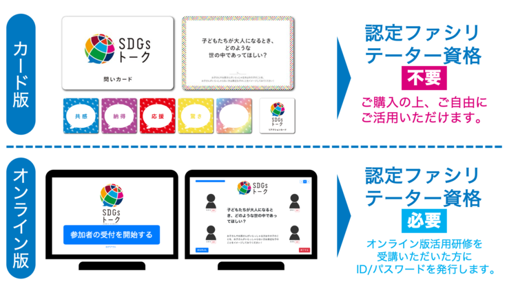 ただ、今回の「SDGsトーク」に関しては、複雑な仕組みをもつゲームでもなく、また、展開のさせ方も自由度が高いため、カード版の利用に関しては認定ファシリテーター資格は不要となります。