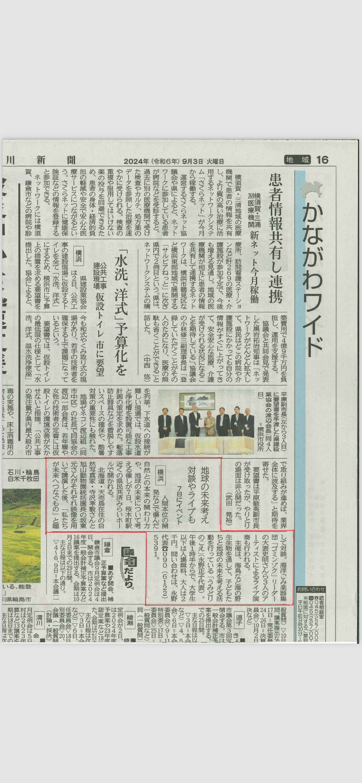 「うみどりのこえ」主催のイベント、「私たちが未来へつなぐもの」が地元紙の神奈川新聞に掲載されました。